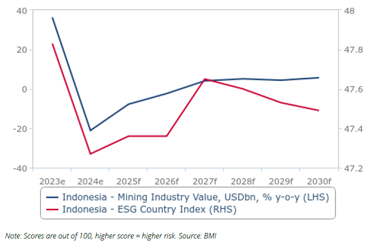 Still, despite the governance shortcomings, BMI forecasts Indonesia’s mining industry will continue to expand. The report suggests that economic imperatives will outweigh environmental, social and governance (ESG) considerations in the near term, leaving the sector’s sustainability profile weak compared with global peers.